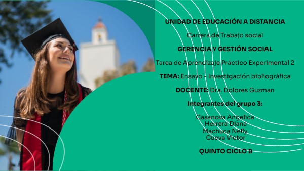 UNIDAD DE EDUCACIÓN A DISTANCIA Carrera de Trabajo social GERENCIA Y GESTIÓN SOCIAL Tarea de Aprendizaje Práctico Experimental 2 TEMA: Ensayo - Investigación bibliográfica DOCENTE: Dra. Dolores Guzman Integrantes del grupo 3: Casanova Angelica Herrera Diana Machuca Nelly Cueva Victor QUINTO CICLO B