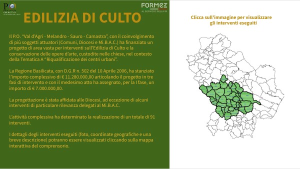 Il P.O. “Val d’Agri - Melandro - Sauro - Camastra”, con il coinvolgimento di più soggetti attuatori (Comuni, Diocesi e Mi.B.A.C.) ha finanziato un progetto di area vasta per interventi sull’Edilizia di Culto e la conservazione delle opere d’arte, custodite nelle chiese, nel contesto della Tematica A “Riqualificazione dei centri urbani”. La Regione Basilicata, con D.G.R n. 502 del 10 Aprile 2006, ha stanziato l’importo complessivo di € 11.280.000,00 articolando il progetto in tre fasi di intervento e con il medesimo atto ha assegnato, per la I fase, un importo di € 7.000.000,00. La progettazione è stata affidata alle Diocesi, ad eccezione di alcuni interventi di particolare rilevanza delegati al Mi.B.A.C. L’attività complessiva ha determinato la realizzazione di un totale di 91 interventi. I dettagli degli interventi eseguiti (foto, coordinate geografiche e una breve descrizione) potranno essere visualizzati cliccando sulla mappa interattiva del comprensorio.