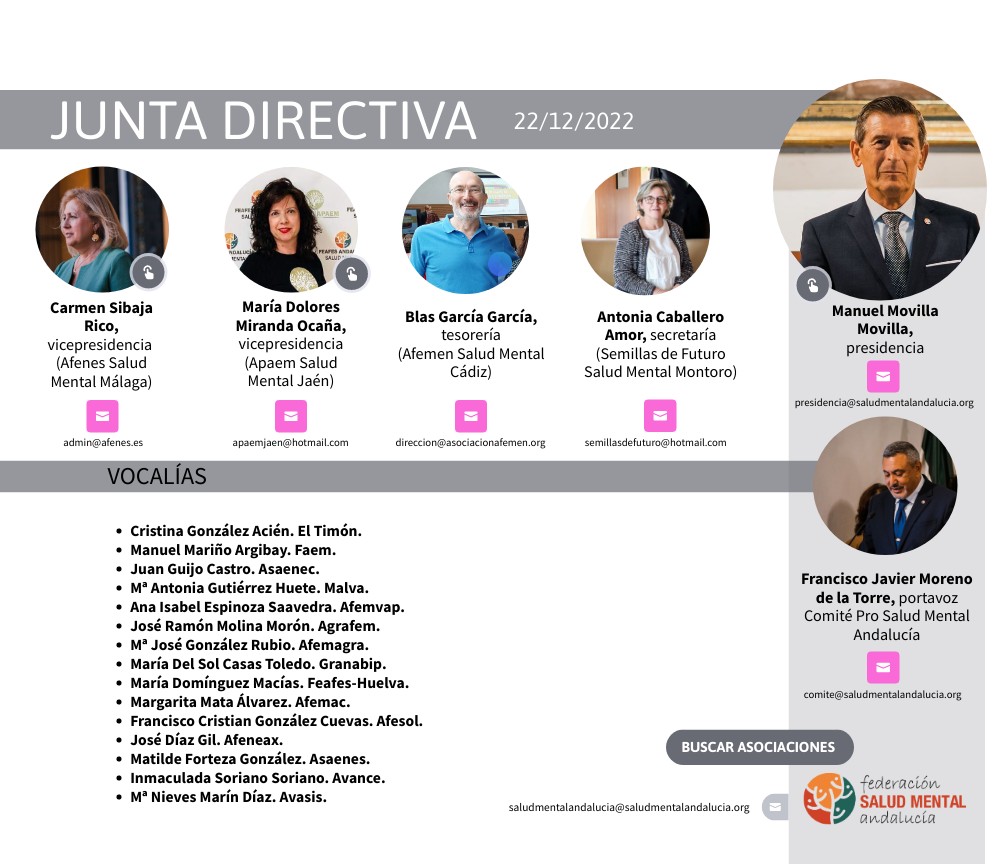 La Asamblea de la Federación Salud Mental Andalucía proclama a Manuel Movilla Movilla presidente el 22 de diciembre de 2022. Movilla repite mandato durante los próximos dos años y mantiene su compromiso de continuar con el proyecto de conciliación y trabajo compartido con todas las entidades; incrementar la transparencia y la participación con garantía de equidad y diversidad en todas las actuaciones llevadas a cabo. Movilla deja claro que los ejes es los que ha fundamentado su programa son los marcados dentro del el Plan Estratégico de la Federación. Con una trayectoria profesional diversa y comprometida, entre 1974 y 1999, se desempeñó como Ingeniero Técncico Industrial en el Polo Químico de Huelva. A partir del año 2000 y hasta el 2009, dedicó su labor al ámbito formativo, ejerciendo como formador en varios centros de Formación Profesional. En el 2011, dio un giro significativo ingresando como persona con experiencia propia en salud mental en Feafes Huelva Salud Mental, donde ha desempeñado diversos roles de responsabilidad. Ha sido vocal, facilitador de ayuda mutua y tesorero. En la actualidad, ostenta el cargo de vicepresidente en dicha asociación, al mismo tiempo que ejerce como presidente de Salud Mental Andalucía. Está casado y tiene 2 hijos.