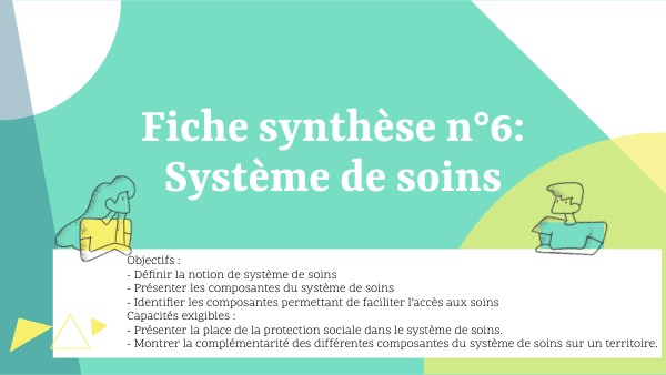 Objectifs : - Définir la notion de système de soins - Présenter les composantes du système de soins - Identifier les composantes permettant de faciliter l’accès aux soins Capacités exigibles : - Présenter la place de la protection sociale dans le système de soins. - Montrer la complémentarité des différentes composantes du système de soins sur un territoire.