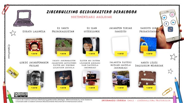 Licencia de Creative Commons Ziberbullying geldiarazteko dekalogoa - Biktimarentzako by Javier Etxeberria is licensed under a Creative Commons Reconocimiento-NoComercial 4.0 Internacional License.