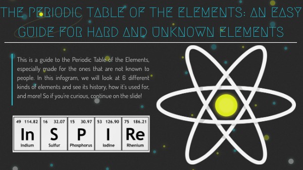 This is a guide to the Periodic Table of the Elements, especially made for the ones that are not known to people. In this infogram, we will look at 6 different kinds of elements and see its history, how it's used for, and more! So if you're curious, continue on the slide!