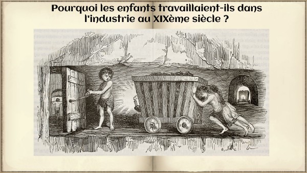 Au XIX ème siècle, les enfants travaillent dans les mines et les usines. Ils font des activités que les adultes ont du mal à faire. Ils travaillent beaucoup et durement. Progressivement, des personnes condamnent le travail des enfants et des lois sont prises pour le limiter. Mais les patrons résistent et les familles ont souvent besoin de ce salaire supplémentaire pour vivre.