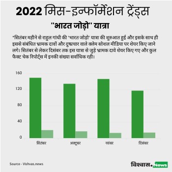 *सितंबर महीने से राहुल गांधी की 'भारत जोड़ो' यात्रा की शुरुआत हुई और इसके साथ ही इससे संबंधित भ्रामक दावों और दुष्प्रचार वाले क्लेम सोशल मीडिया पर शेयर किए जाने लगे। सितंबर से लेकर दिसंबर तक इस यात्रा से जुड़े भ्रामक दावे शेयर किए गए और कुल फैक्ट चेक रिपोर्ट्स में इनकी संख्या सर्वाधिक रही।