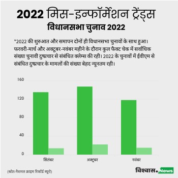 *2022 की शुरुआत और समापन दोनों ही विधानसभा चुनावों के साथ हुआ। फरवरी-मार्च और अक्टूबर-नवंबर महीने के दौरान कुल फैक्ट चेक में सर्वाधिक संख्या चुनावी दुष्प्रचार से संबंधित क्लेम्स की रही। 2022 के चुनावों में ईवीएम से संबंधित दुष्प्रचार के मामलों की संख्या बेहद न्यूनतम रही।