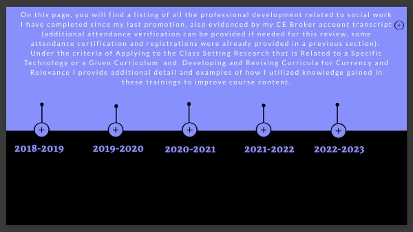 On this page, you will find a listing of all the professional development related to social work I have completed since my last promotion, also evidenced by my CE Broker account transcript (additional attendance verification can be provided if needed for this review, some attendance certification and registrations were already provided in a previous section). Under the criteria of Applying to the Class Setting Research that is Related to a Specific Technology or a Given Curriculum and Developing and Revising Curricula for Currency and Relevance I provide additional detail and examples of how I utilized knowledge gained in these trainings to improve course content.