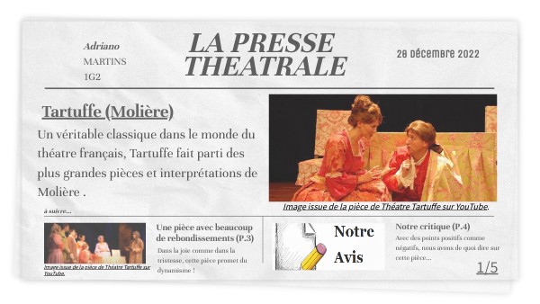 Tartuffe est une pièce assez divertissante, elle a de quoi nous mettre dans le feu de l'action pendant 2 bonnes heures avec tout ce qui se passe dans celle-ci.De plus, le fait que l'histoire soit basée principalement sur 1 personnage qui est Tartuffe cela permet de ne pas trop se perdre dans l'histoire car c'est ce personnage le centre de toute chose dans la pièce ! Les personnages jouent tous un rôle assez important pour chacun d'entre eux que ce soit pour Dorine qui va influencer sur beaucoup de choix des personnages tels que Orgon,Mariane ou même Valère. Enfin la morale que l'on retire de cette pièce est que: "Rien ne reprend mieux les hommes que la peinture de leurs défauts" Cela est pour inciter les hommes a ne plus être des hypocrites et faux dévots .