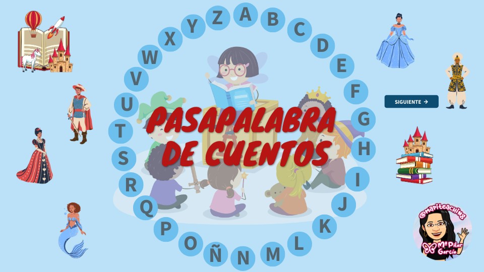 Pasapalabra relacionado con los cuentos. Hace alusión a personajes, objetos y títulos de cuentos o libros de literatura infantil-juvenil. Muy adecuado como juego de animación a la lectura. Para niños/as a partir de 3 años.