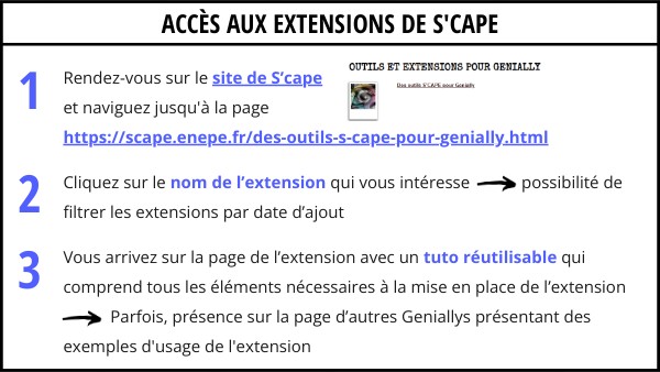 Vous arrivez sur la page de l’extension avec un tuto réutilisable qui comprend tous les éléments nécessaires à la mise en place de l’extension Parfois, présence sur la page d’autres Geniallys présentant des exemples d'usage de l'extension