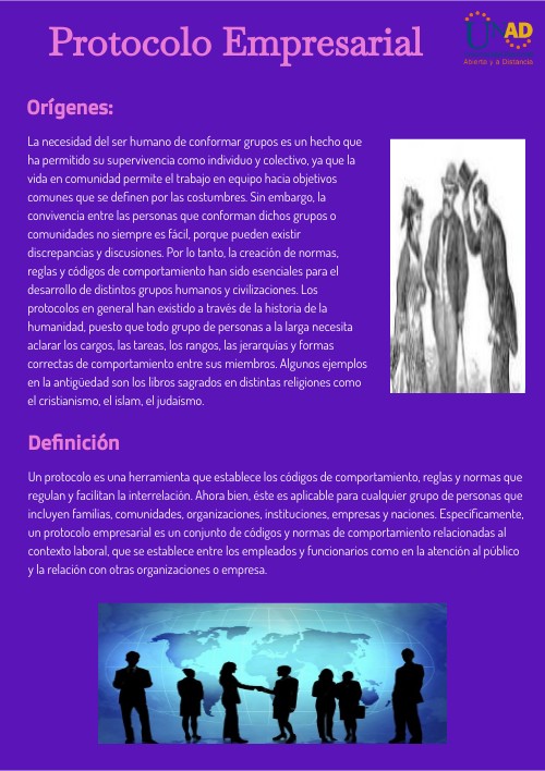 Un protocolo es una herramienta que establece los códigos de comportamiento, reglas y normas que regulan y facilitan la interrelación. Ahora bien, éste es aplicable para cualquier grupo de personas que incluyen familias, comunidades, organizaciones, instituciones, empresas y naciones. Específicamente, un protocolo empresarial es un conjunto de códigos y normas de comportamiento relacionadas al contexto laboral, que se establece entre los empleados y funcionarios como en la atención al público y la relación con otras organizaciones o empresa.