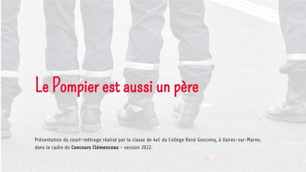 Présentation destinée à compiler toutes les éléments entrés en ligne de compte pour l'écriture et la réalisation du court-métrage "Le Pompier est aussi un père"