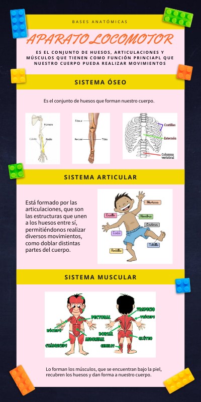 Está formado por las articulaciones, que son las estructuras que unen a los huesos entre sí, permitiéndonos realizar diversos movimientos, como doblar distintas partes del cuerpo.