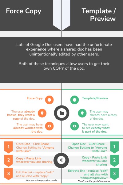 Lots of Google Doc users have had the unfortunate experience where a shared doc has been unintentionally edited by other users. Both of these techniques allow users to get their own COPY of the doc.