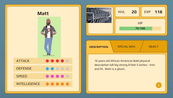 16 years old African American Bald physical description tall big strong 8 feet 5 inches - trim and fit. Matt is a ghost.