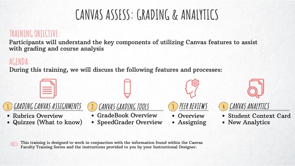 This training is designed to work in conjunction with the information found within the Canvas Faculty Training Series and the instructions provided to you by your Instructional Designer.