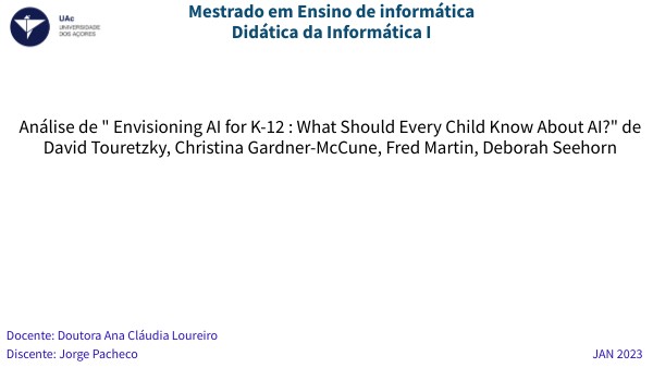 Na unidade curricular de Didática da Informática I, foi proposta a análise de 2 artigos cIentíficos, relacionados com os conteúdos programáticos da referida unidade curricular. Desta forma apresento separadamente a análise de cada artigo e selecionei este, por definir as diretrizes para o ensino da Inteligência Artificial nos vários níveis de ensino e por ser referenciado no artigo "Machine Learning Application with AI-Robotics Tool - What We Learned from Pilot Studies" de Amy Eguchi.