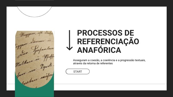Compreendida a noção de referente/antecedente, de retoma por anáfora e por catáfora, deves agora empenhar-te em compreender e distinguir os diversos processos de referenciação. Lê a informação e analisa os exemplos. Coloca as dúvidas que tiveres. Em seguida, realizarás um questionário de aferição da aprendizagem que efetuaste.