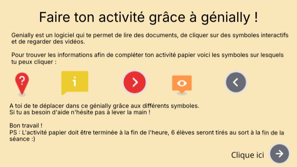 Genially est un logiciel qui te permet de lire des documents, de cliquer sur des symboles interactifs et de regarder des vidéos. Pour trouver les informations afin de compléter ton activité papier voici les symboles sur lesquels tu peux cliquer :