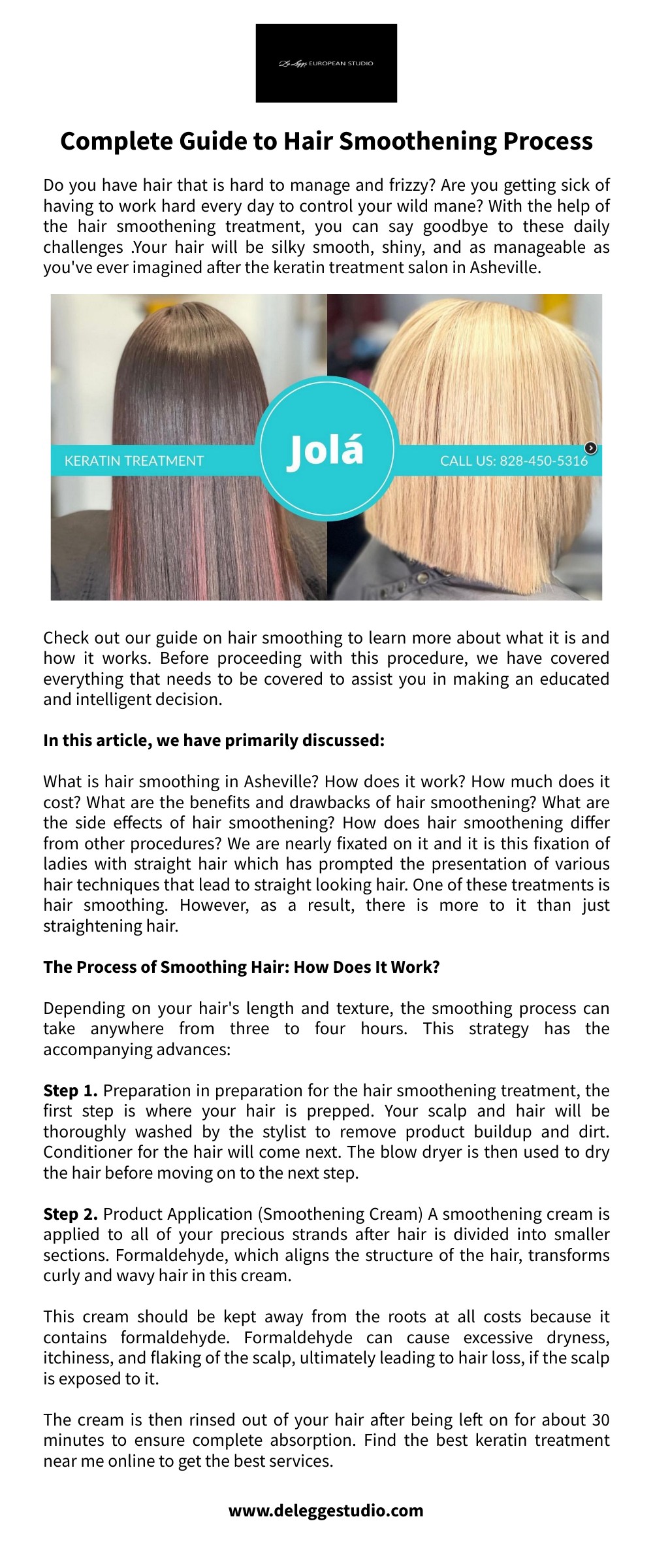 Check out our guide on hair smoothing to learn more about what it is and how it works. Before proceeding with this procedure, we have covered everything that needs to be covered to assist you in making an educated and intelligent decision.In this article, we have primarily discussed:What is hair smoothing in Asheville? How does it work? How much does it cost? What are the benefits and drawbacks of hair smoothening? What are the side effects of hair smoothening? How does hair smoothening differ from other procedures? We are nearly fixated on it and it is this fixation of ladies with straight hair which has prompted the presentation of various hair techniques that lead to straight looking hair. One of these treatments is hair smoothing. However, as a result, there is more to it than just straightening hair.The Process of Smoothing Hair: How Does It Work?Depending on your hair's length and texture, the smoothing process can take anywhere from three to four hours. This strategy has the accompanying advances:Step 1. Preparation in preparation for the hair smoothening treatment, the first step is where your hair is prepped. Your scalp and hair will be thoroughly washed by the stylist to remove product buildup and dirt. Conditioner for the hair will come next. The blow dryer is then used to dry the hair before moving on to the next step.Step 2. Product Application (Smoothening Cream) A smoothening cream is applied to all of your precious strands after hair is divided into smaller sections. Formaldehyde, which aligns the structure of the hair, transforms curly and wavy hair in this cream.This cream should be kept away from the roots at all costs because it contains formaldehyde. Formaldehyde can cause excessive dryness, itchiness, and flaking of the scalp, ultimately leading to hair loss, if the scalp is exposed to it.The cream is then rinsed out of your hair after being left on for about 30 minutes to ensure complete absorption. Find the best keratin treatment near me online to get the best services.