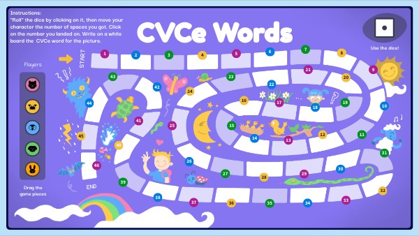 Instructions: "Roll" the dice by clicking on it, then move your character the number of spaces you got. Click on the number you landed on. Write on a white board the CVCe word for the picture.