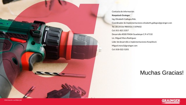Contacto de información: Keepstock Grainger Ing. Elizabeth Gallegos Rdz. Coordinador de Implementaciones elizabeth.gallegos@grainger.com Tel. (81) 8156 9800 Ext. 5109602 Cel. 811-821 5357 Desarrollo #500 FINSA Guadalupe C.P. 67132 Lic. Miguel Mora Rodríguez Líder de desarrollo e implementaciones KeepStock Miguel.mora1@grainger.com Cel. 818-022-5201