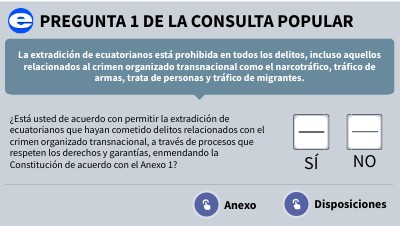 ¿Está usted de acuerdo con permitir la extradición de ecuatorianos que hayan cometido delitos relacionados con el crimen organizado transnacional, a través de procesos que respeten los derechos y garantías, enmendando la Constitución de acuerdo con el Anexo 1?
