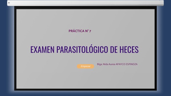REFERENCIAS • Departamento de Microbiología Parasitología e Inmunología. (2010). Guía de Trabajos Prácticos - Parasitología. FACULTAD DE MEDICINA UNIVERSIDAD DE BUENOS AIRES. https://xdoc.mx/documents/guia-de-tp-parasitologia-facultad-de-medicina-5f208a8e5d3ee • Guevara Montero, R., & Navarro Torres, M. (2014). Manual de Prácticas de Laboratorio de Parasitología. Universidad Nacional de San Cristóbal de Huamanga. • Instituto Nacional de Salud. (1999). Manual Procedimientos de Laboratorio. • ORGANIZACIÓN PANAMERICANA DE LA SALUD. (1983). MANUAL DE TÉCNICAS BÁSICAS PARA UN LABORATORIO DE SALUD (ORGANIZACI). . INS. Manual de procedimientos de laboratorio para el diagnóstico de los parásitos intestinales del hombre. 2003. Serie de normas técnicas N° 37. Terashima Angélica, Marcos Luis, Maco Vicente, Canales Marco, Samalvides Frine, Tello Raúl. Técnica de sedimentación en tubo de alta sensibilidad para el diagnóstico de parásitos intestinales. Rev. gastroenterol. Perú [Internet]. 2009 Oct [citado 2020 Ago 27] ; 29( 4 ): 305-310. Disponible en: http://www.scielo.org.pe/scielo.php?script=sci_arttext&pid=S1022-51292009000400002&lng=es • Universidad María Auxiliadora. (2020). Parasitología. https://www.studocu.com/pe/document/universidad-maria-auxiliadora/parasitologia/tecnicas-de-coloracion/9530121