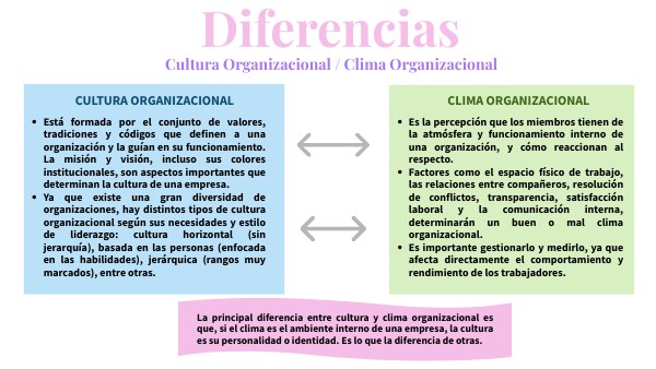 La principal diferencia entre cultura y clima organizacional es que, si el clima es el ambiente interno de una empresa, la cultura es su personalidad o identidad. Es lo que la diferencia de otras.