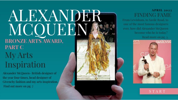Alexander McQueen- British designer of the year four times, head designer of Givenchy fashion and my arts inspiration. Find out more on pg. 7