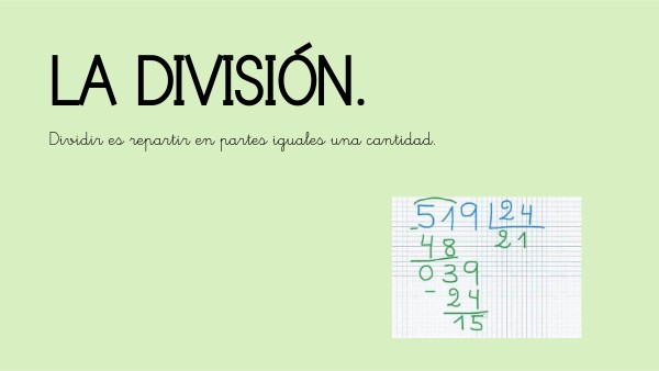 1.- Buscamos un número que multiplicado por el divisor se acerca, sin pasarse, al dividendo. Este número será el cociente. 2.- Restamos al dividendo el cociente multiplicado por el divisor. Observamos el resultado, ese número será el resto. 3.- Si el resto es igual a 0 o es menor que el divisor, hemos terminado la resta. 4.- Hacemos la prueba de la división para comprobar si la multiplicación está bien hecha.