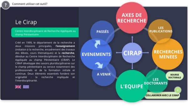 Created in 1999, the research department has two main missions, teaching (initiation to research, supervision of student work, thematic courses) and research, devolved to the Interdisciplinary Center for Applied Research in the Penitentiary Field (CIRAP). CIRAP develops interdisciplinary knowledge in the penitentiary field, serving professionals and initial and continuing training in particular. Two essential elements underpin its originality: involved research and interdisciplinarity.