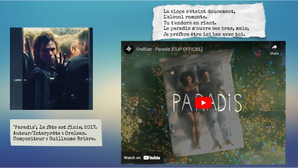 "Paradis", La fête est finie, 2017. Auteur/Interprête : Orelsan. Compositeur : Guillaume Brière.
