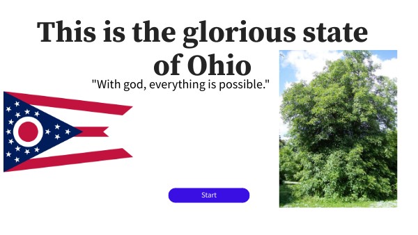 Ohio flag, Slide 1: https://en.wikipedia.org/wiki/Ohio#/media/File:Flag_of_Ohio.svg Columbus, Ohio, Slide 3: https://www.usatipps.de/bundesstaaten/mittlerer-westen/ohio/columbus/ Ohio Map, Slide 3: By National Atlas, Public Domain, https://commons.wikimedia.org/w/index.php?curid=1056250 Columbus Flag, Slide 3: By Alex43223 - http://www.worldstatesmen.org/US_Mayors.html, Public Domain, https://commons.wikimedia.org/w/index.php?curid=4220122 Ohio Ancestry Picture, Slide 3: https://aging.ohio.gov/ Ohio in the United States, Slide 4: https://en.wikipedia.org/wiki/File:Ohio_in_United_States.svg Ohio Map, Slide 5: By Icy98 - Own work, CC BY-SA 4.0, https://commons.wikimedia.org/w/index.php?curid=114056099 Rock and Roll Hall of Fame, Slide 6: By Jason Pratt from Pittsburgh, PA (FishSpeaker) - Flickr, CC BY 2.0, https://commons.wikimedia.org/w/index.php?curid=346491 Cleveland Museum of Art, Slide 6: By Daderot - Own work, Public Domain, https://commons.wikimedia.org/w/index.php?curid=4373972 West Side Market, Slide 6: CC BY 2.0, https://commons.wikimedia.org/w/index.php?curid=554086 Buckeye Candy, Slide 7: By Steven Depolo - Cropped from Flickr version: https://www.flickr.com/photos/10506540@N07/3609747176, CC BY 2.0, https://commons.wikimedia.org/w/index.php?curid=41686637 Sauerkraut Balls, Slide 7: https://roadfood.com/recipe/sauerkraut-balls https://commons.m.wikimedia.org/wiki/File:Cincinnati-procter-and-gamble-headquarters.jpg#mw-jump-to-license