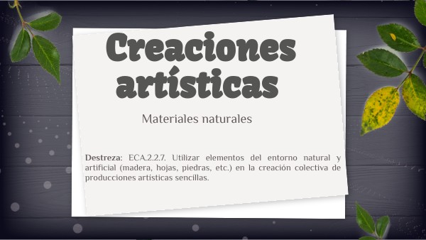 Destreza: ECA.2.2.7. Utilizar elementos del entorno natural y artificial (madera, hojas, piedras, etc.) en la creación colectiva de producciones artísticas sencillas.
