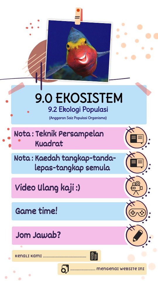 Laman web interaktif ini adalah untuk guru dan murid sekolah menengah yang mengambil subjek Biologi, berkhusus kepada subtopik 9.2: Ekologi populasi (Biologi tingkatan 5). Laman web intraktif ini merangkumi nota, video, permainan atas talian serta latihan berkaitan Anggaran Saiz Populasi Organisma.