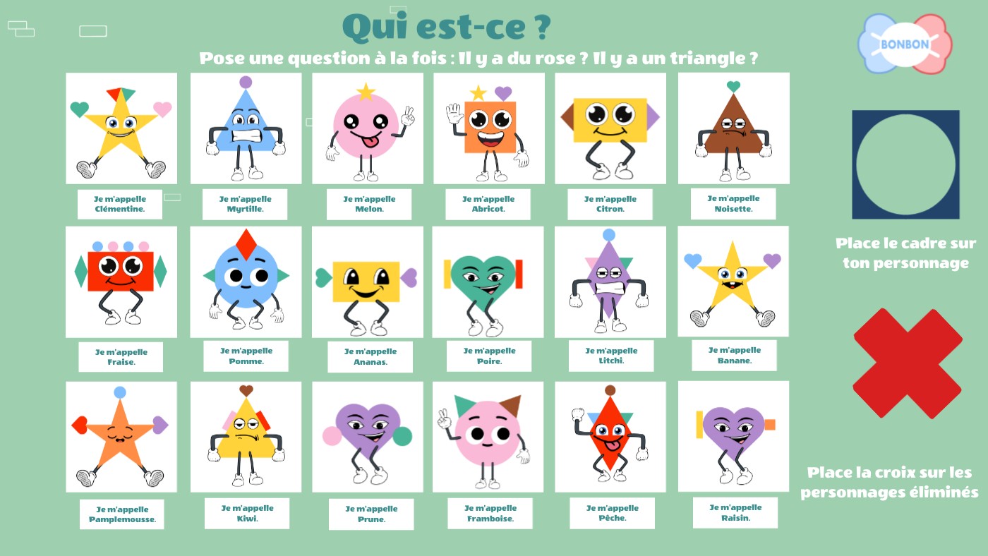 Pose une question à la fois : Il y a du rose ? Il y a un triangle ?