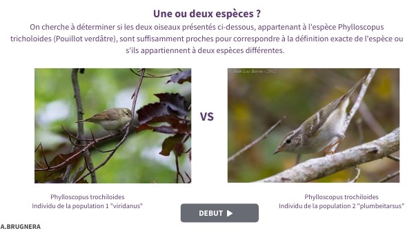 On cherche à déterminer si les deux oiseaux présentés ci-dessous, appartenant à l'espèce Phylloscopus tricholoides (Pouillot verdâtre), sont suffisamment proches pour correspondre à la définition exacte de l'espèce ou s'ils appartiennent à deux espèces différentes.