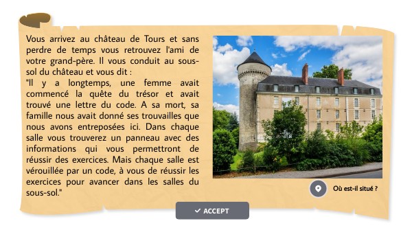 Vous arrivez au château de Tours et sans perdre de temps vous retrouvez l'ami de votre grand-père. Il vous conduit au sous-sol du château et vous dit : "Il y a longtemps, une femme avait commencé la quête du trésor et avait trouvé une lettre du code. A sa mort, sa famille nous avait donné ses trouvailles que nous avons entreposées ici. Dans chaque salle vous trouverez un panneau avec des informations qui vous permettront de réussir des exercices. Mais chaque salle est vérouillée par un code, à vous de réussir les exercices pour avancer dans les salles du sous-sol."