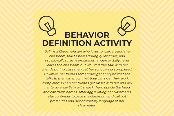 Sally is a 12-year-old girl who loves to walk around the classroom, talk to peers during quiet times, and occasionally scream profanities randomly. Sally never leaves the classroom but would rather talk with her friends during class then get her schoolwork completed. However, her friends sometimes get annoyed that she talks to them so much that they can’t get their work completed. When her friends get upset with her and ask her to go away Sally will smack them upside the head and call them names, After aggravating her classmates she continues to pace the classroom and call out profanities and discriminatory language at her classmates.