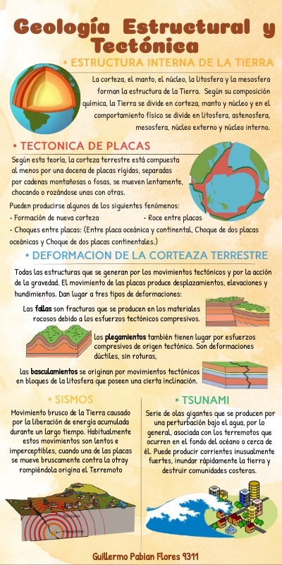 Todas las estructuras que se generan por los movimientos tectónicos y por la acción de la gravedad. El movimiento de las placas produce desplazamientos, elevaciones y hundimientos. Dan lugar a tres tipos de deformaciones: