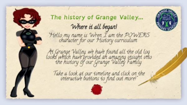 "Hello my name is Wren. I am the POWERS character for our History curriculum At Grange Valley, we have found all the old log looks which have provided an amazing insight into the history of our Grange Valley Family. Take a look at our timeline and click on the interactive buttons to find out more!"
