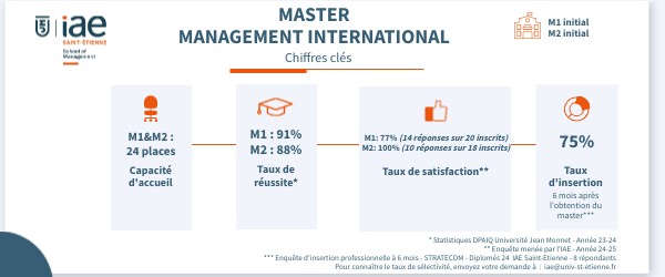 * Statistiques DPAIQ Université Jean Monnet - Année 23-24** Enquête menée par l'IAE - Année 24-25 *** Enquête d'insertion professionnelle à 6 mois - STRATECOM - Diplomés 24 IAE Saint-Etienne - 8 répondantsPour connaître le taux de sélectivité, envoyez votre demande à : iae@univ-st-etienne.fr