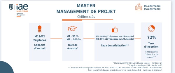 * Statistiques DPAIQ Université Jean Monnet - Année 23-24** Enquête menée par l'IAE - Année 24-25 *** Enquête d'insertion professionnelle à 6 mois - STRATECOM - Diplomés 24 IAE Saint-Etienne - 29 répondants Pour connaître le taux de sélectivité, envoyez votre demande à : iae@univ-st-etienne.fr