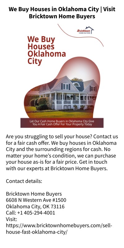 Are you struggling to sell your house? Contact us for a fair cash offer. We buy houses in Oklahoma City and the surrounding regions for cash. No matter your home’s condition, we can purchase your house as-is for a fair price. Get in touch with our experts at Bricktown Home Buyers. Contact details:Bricktown Home Buyers6608 N Western Ave #1500 Oklahoma City, OK 73116Call: +1 405-294-4001Visit: https://www.bricktownhomebuyers.com/sell-house-fast-oklahoma-city/