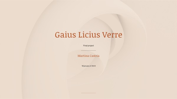L’accusato è Gaio Licinio Verre che aveva ricoperto l’incarico di governatore della Sicilia dal 73 al 71 a.C. Durante tale periodo si era arricchito enormemente, in modo scandaloso, rubando ogni cosa, cercando anche corrompere coloro che si opponevano al suo modo di fare. Incaricato di difendere i Siciliani, Cicerone ebbe a che fare con un’accusa non facile. Infatti, Verre, di origine aristocratica, era amico dei cittadini più in vista e potenti mentre Cicerone era un uomo nuovo. Pur contando sull’amicizia di Pompeo, Cicerone dovette combattere a lungo affinché gli fosse assegnato l’incarico della difesa dei Siciliani. Nella sua prima arringa contro Verre, Cicerone espone le basi dell’accusa, facendo temere ai giudici la collera del popolo. Quindi produce tutte le prove necessarie e i testimoni. Per sostenere l’accusa