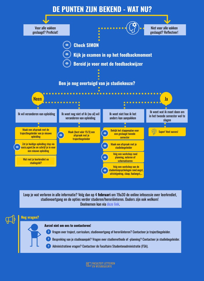 - Bespreking van je resultaten? Vragen over studiemethode en -planning? Contacteer je studiebegeleider.