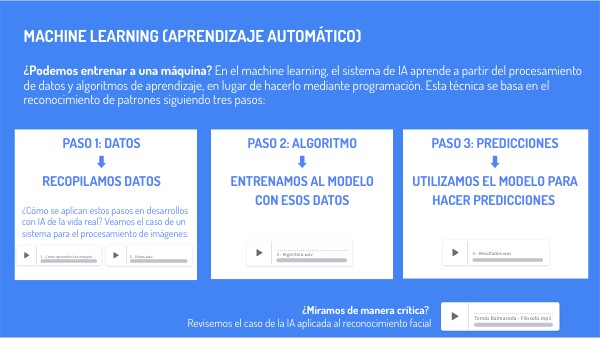 ¿Podemos entrenar a una máquina? En el machine learning, el sistema de IA aprende a partir del procesamiento de datos y algoritmos de aprendizaje, en lugar de hacerlo mediante programación. Esta técnica se basa en el reconocimiento de patrones siguiendo tres pasos: