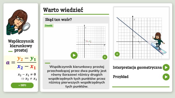 Współczynnik kierunkowy prostej przechodzącej przez dwa punkty jest równy ilorazowi różnicy drugich współrzędnych tych punktów przez różnicę pierwszych współrzędnych tych punktów.