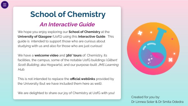 We hope you enjoy exploring our School of Chemistry at the University of Glasgow (UofG) using this Interactive Guide. This guide is intended to support those who are curious about studying with us and also for those who are just curious! We have a welcome video and 360° tours of: Chemistry, its facilities, the campus, some of the notable UofG buildings (Gilbert Scott Building, aka Hogwarts), and our purpose-built JMS Learning Hub. This is not intended to replace the official weblinks provided by the University (but we have included them here as well). We are delighted to share our joy of Chemistry at UofG with you!