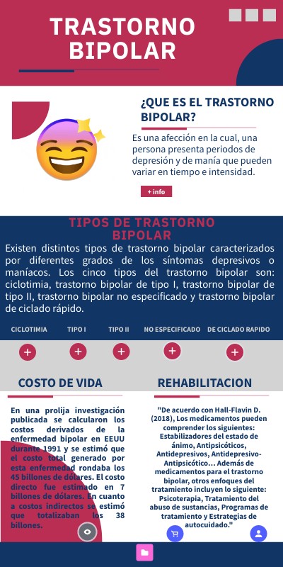 "De acuerdo con Hall-Flavin D. (2018), Los medicamentos pueden comprender los siguientes: Estabilizadores del estado de ánimo, Antipsicóticos, Antidepresivos, Antidepresivo-Antipsicótico… Además de medicamentos para el trastorno bipolar, otros enfoques del tratamiento incluyen lo siguiente: Psicoterapia, Tratamiento del abuso de sustancias, Programas de tratamiento y Estrategias de autocuidado."